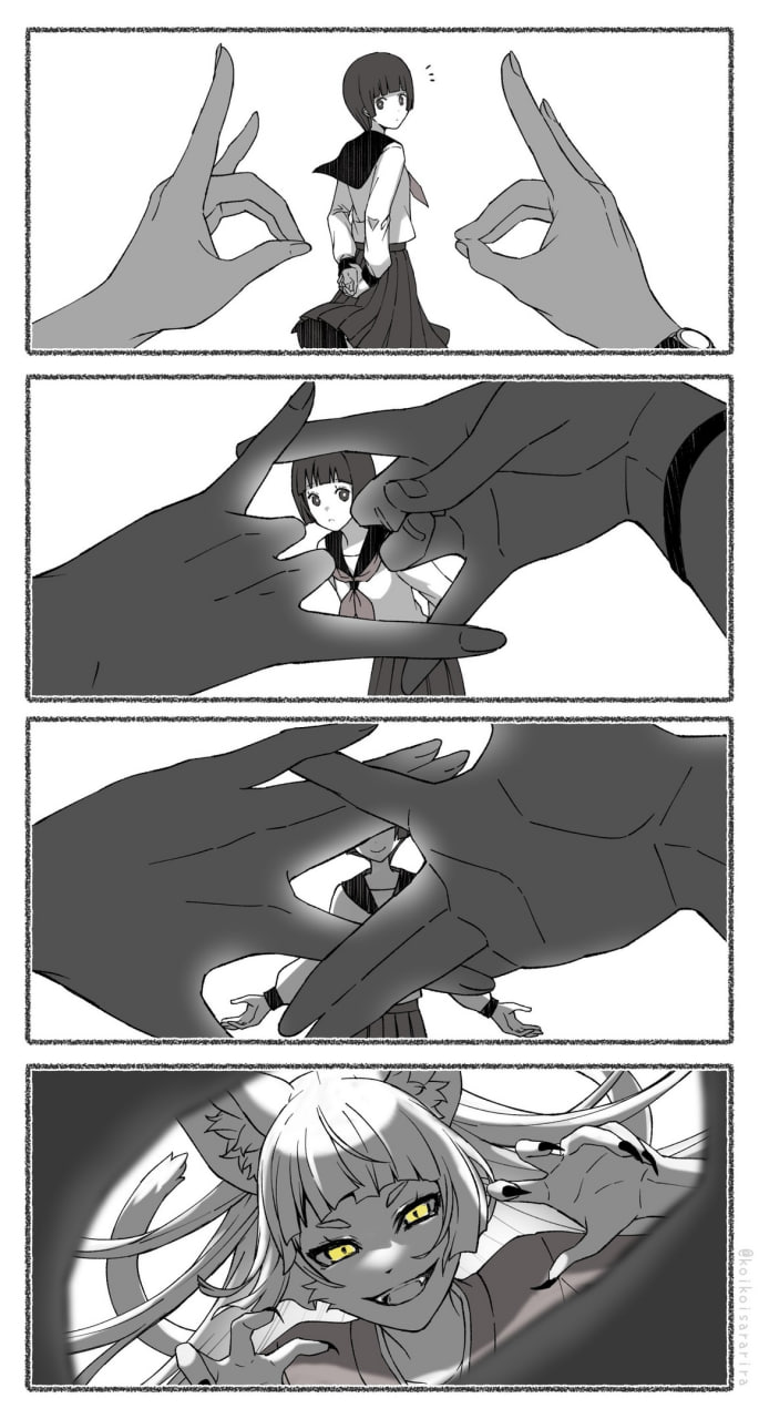 Способ назывался 狐の窓 кицунэ-но мадо – дословно «лисье окно» или «окно кицунэ». Если сложить пальцы определённым образом и посмотреть через отверстие между пальцами, то можно увидеть волшебное и невидимое – например, истинный облик превратившегося оборотня или нечто, скрытое колдовством.